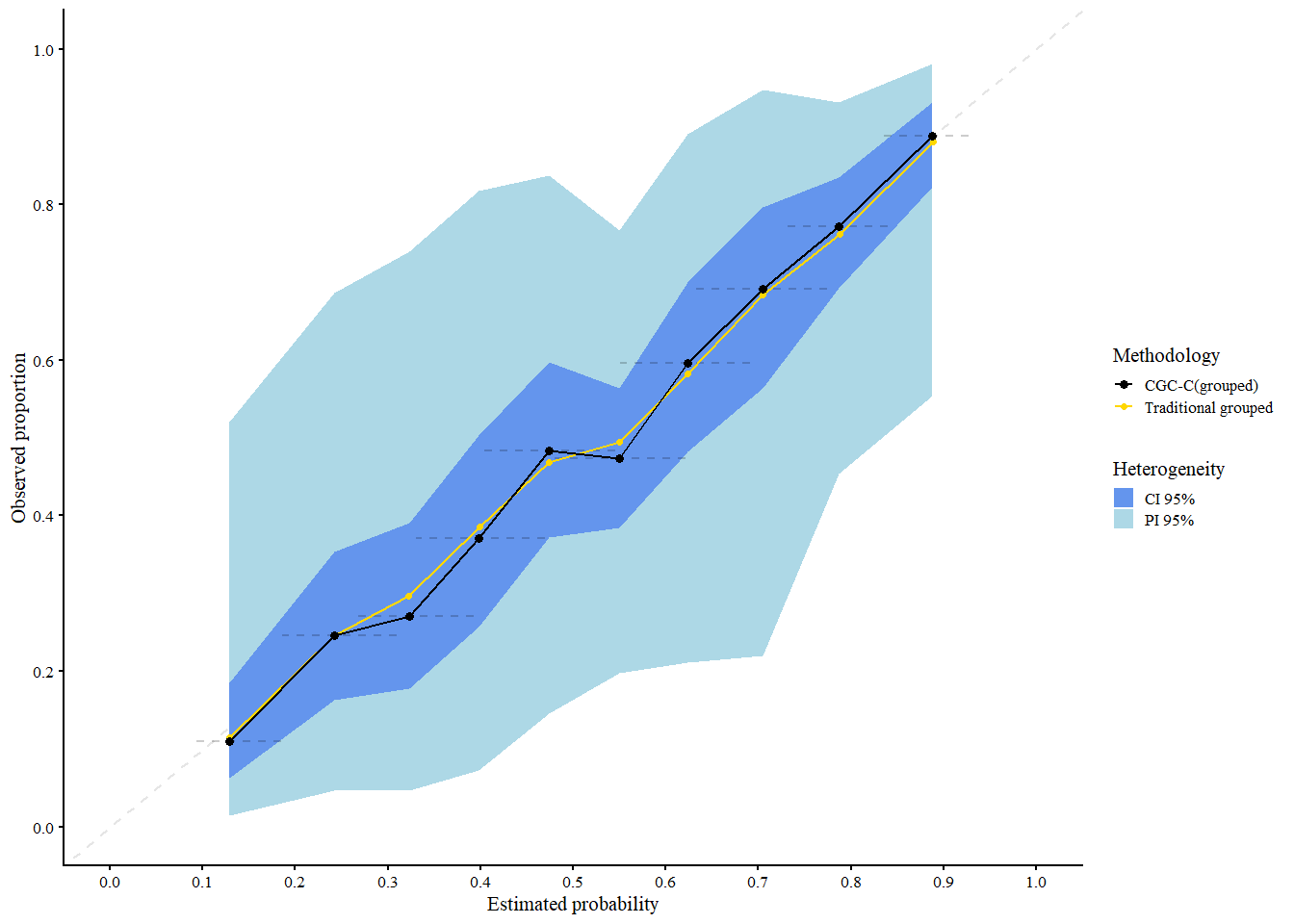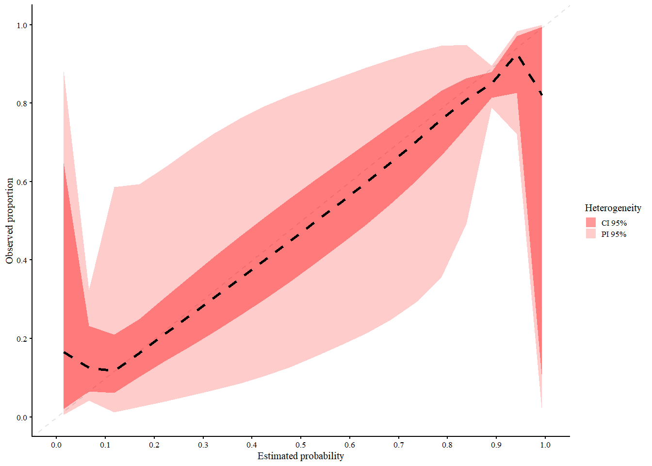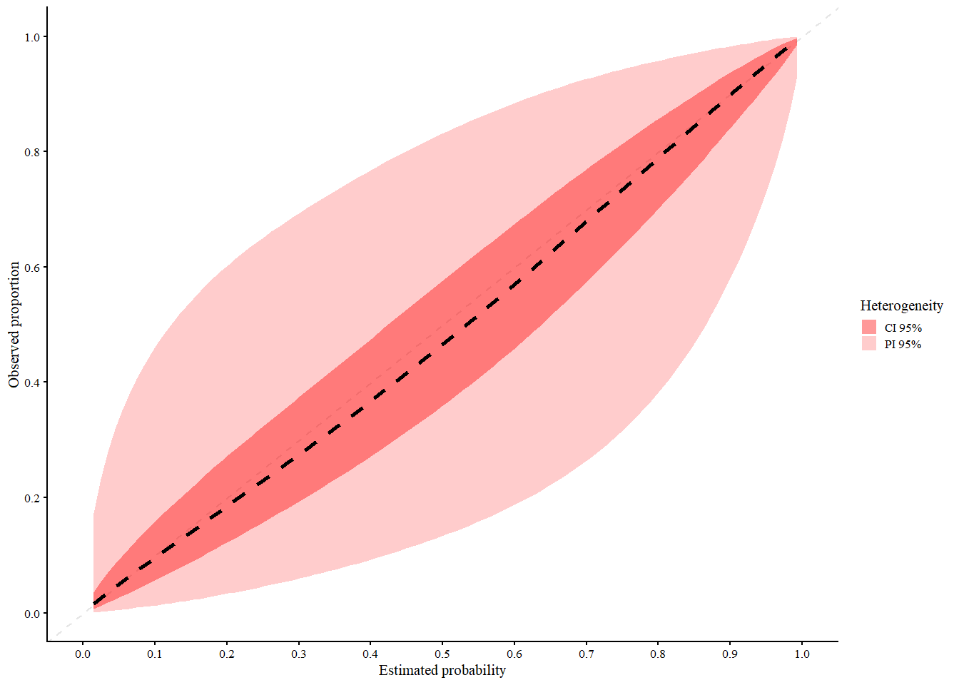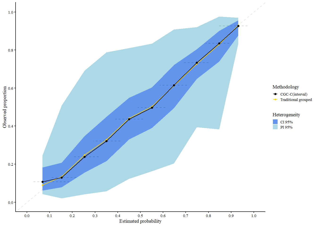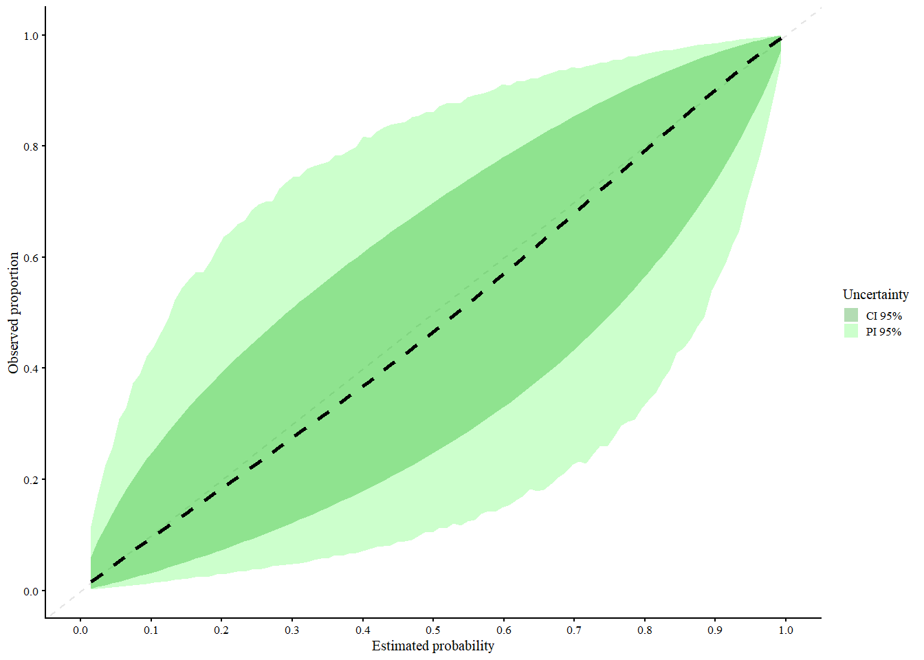 - Dark green = 95% Confidence Interval (expected calibration of the pooled curve it can be calculated with Delta method or normal approximation)