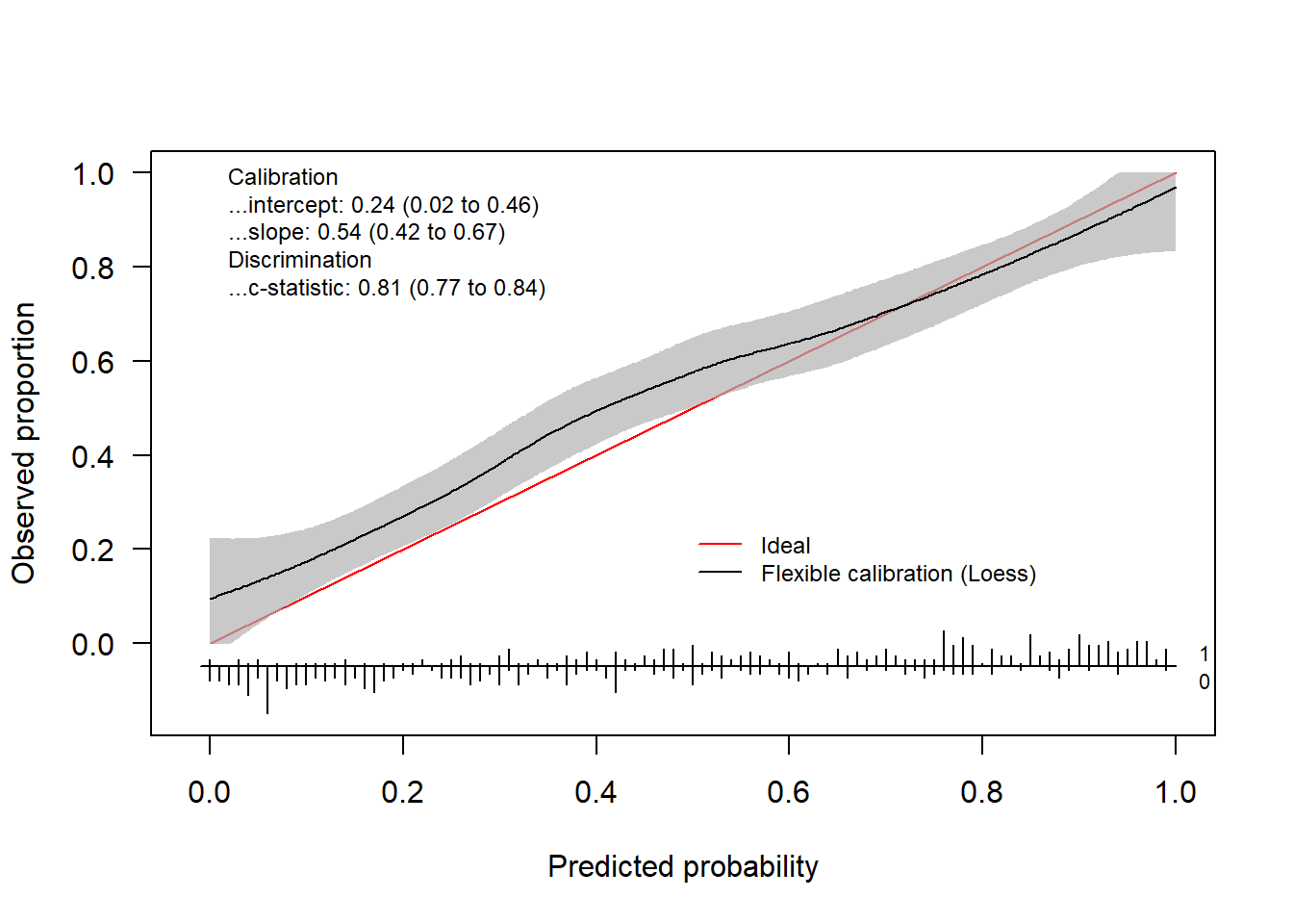 #> A 95% confidence interval is given for the calibration intercept and calibration slope.